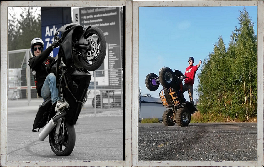 Mönkijällä kikkailun hoitaa Jarno Yamaha Raptor 660cc:lla. Raptorikaan ei ole ihan vakio, kaatumarautoja ei sentään ole mönkijään laitettu mutta "jalkatapit" on asennettu karjarautaan helpottamaan erinäisiä temppuja =)