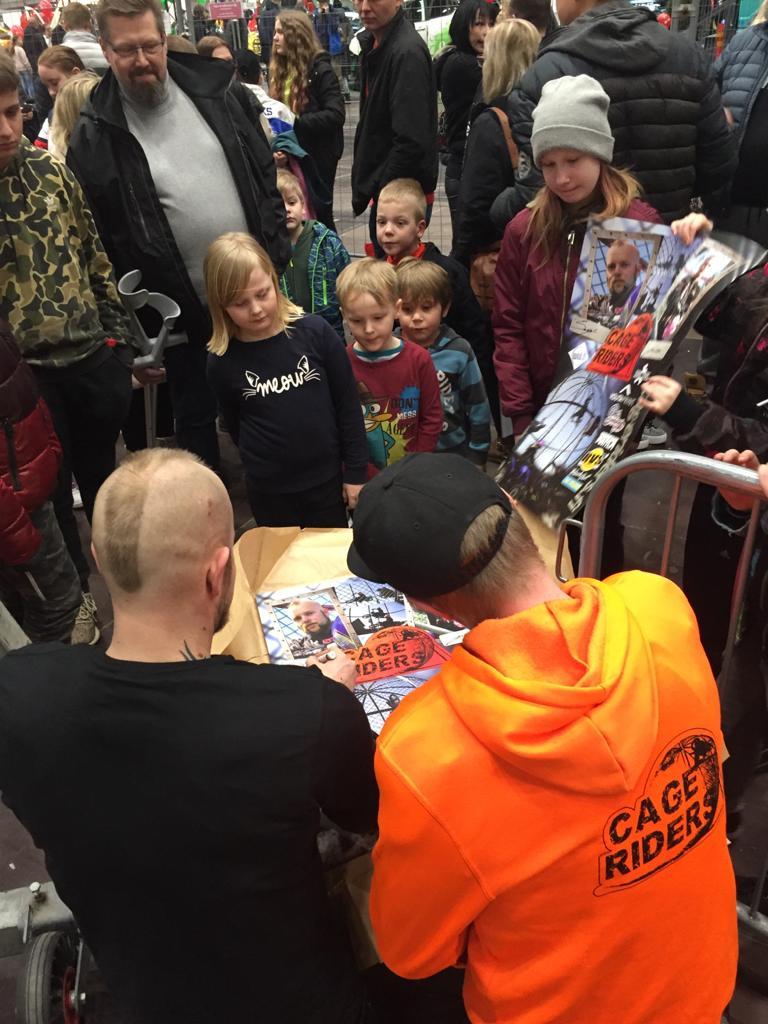 Väkeä riitti mainiosti markkinoilla ja ihmiset näyttivät viihtyvän hyvin. Kaikki ajot saatiin ajettua vaikkakin la aamun ensimmäisessä meinasi tulla hieman kiire kun huomattiin, että Sasjalta on iskarin alapään pultti mennyt poikki mutta tämäkin saatin hyvissä ajoin eli n. 15 min ennen esitystä korjattua =)